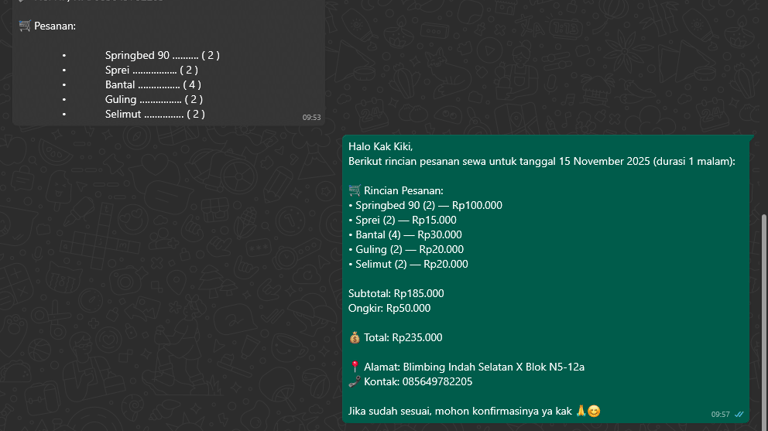 Pemesanan dianggap berhasil setelah ada konfirmasi dari admin.